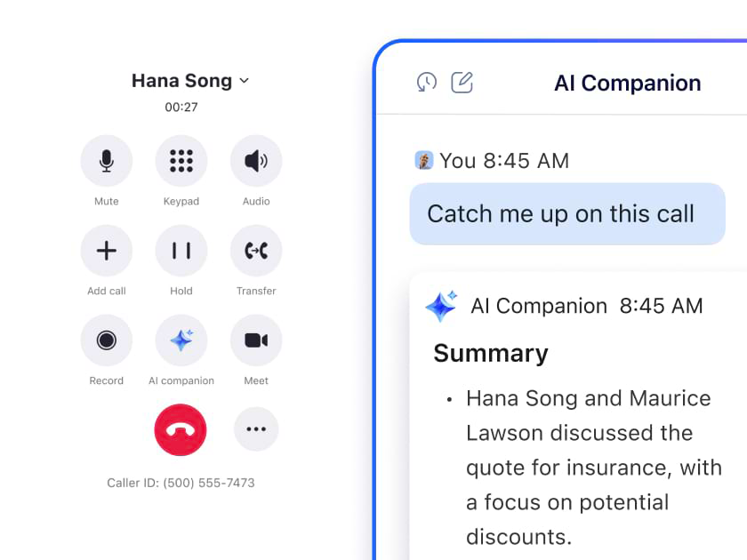 AI Companion for Zoom Phone takes tedious phone tasks off your plate — turning calls and voicemails into summaries and action items, so you can stay focused on conversations, not busy work.
